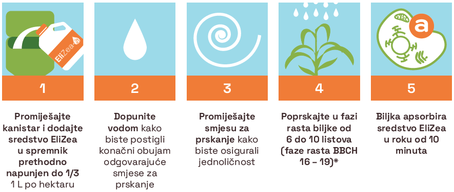 Sredstvo EliZea namijenjeno je za primjenu na zdravim biljkama koje nemaju nedostatka dušika, fosfora ni esencijalnih elemenata. Može se upotrebljavati u kombinaciji s gnojivima. Ovaj