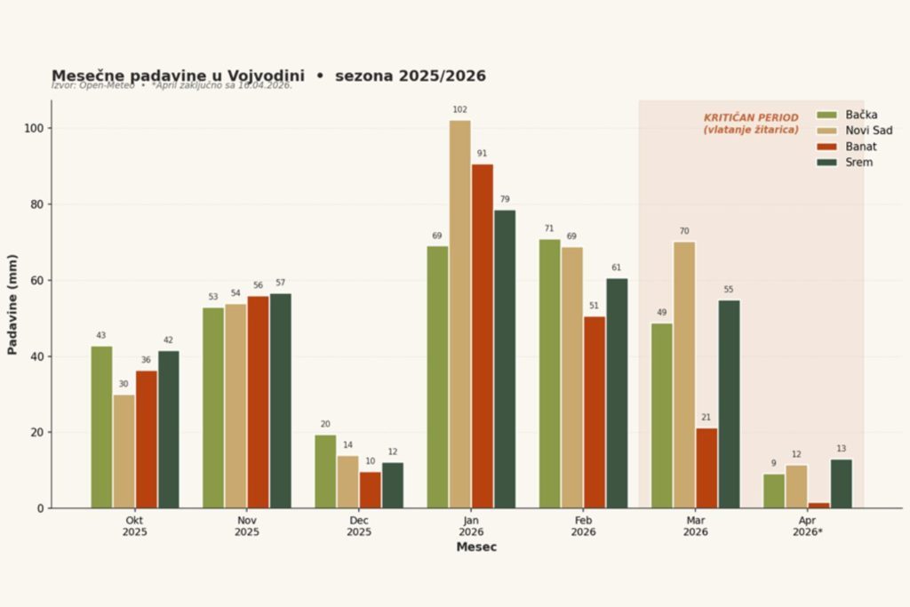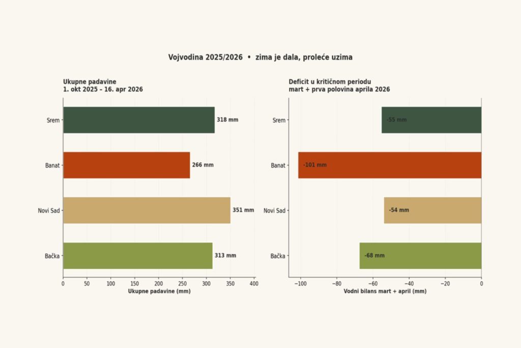 Sezona 2026. krenula je u dobrim uslovima zahvaljujući darežljivoj zimi. Ali dobar start nije garancija dobrog finala. Podaci jasno pokazuju da se uslovi menjaju – mart i april su suvi u celoj Vojvodini, sa posebno zabrinjavajućom situacijom u Banatu.