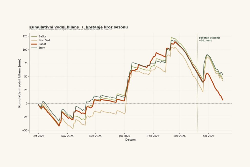 Metodološka napomena: Analiza je rađena na osnovu dnevnih meteo podataka iz Open-Meteo baze za četiri reprezentativne lokacije u Vojvodini (Bačka: 45.61°N 19.52°E; Novi Sad: 45.25°N 19.83°E; Banat: 45.76°N 20.58°E; Srem: 45.05°N 19.68°E). Evapotranspiracija računata po FAO metodi. Period analize: 1. oktobar 2025. – 16. april 2026.