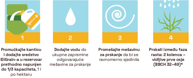 • EliGrain-a može da se koristi u mešavini u rezervoaru sa većinom sredstava za zaštitu bilja, uključujući fungicide, herbicide i insekticide. Za dodatne informacije u vezi sa pitanjima kompatibilnosti, konsultujte se sa svojim tehničkim savetnikom.